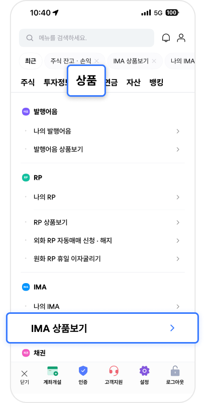 • IMA(종합투자계좌, 이하 IMA)는 고객으로부터 예탁받은 자금을 통합하여 기업신용공여 등 기업금융관련자산 등에 운용하고, 그 결과 발생한 수익을 고객에게 지급하는 것을 목적으로 종합금융투자사업자가 개설한 계좌를 말합니다.